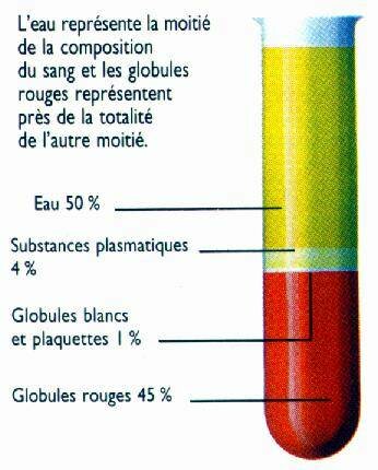 Il est composé d'un liquide : Le PLASMA ; d'éléments cellulaires : GLOBULES ROUGES ou Hématies ou Érythrocytes ; de GLOBULES BLANCS ou Leucocytes ; de PLAQUETTES ou Thrombocytes ; et de substances dissoutes. L'eau représente la moitié de la composition du sang et les globules rouges représentent près de la totalité de l'autre moitié ; voir le diagramme :