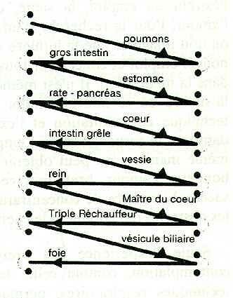 Chaque Méridien est doté d'un point d'entrée, d'un point source (sur lequel on peut stimuler ou disperser en toutes saisons), d'un point de stimulation ou d'affaiblissement (qui varient en fonction des saisons), et d'un point de sortie. A certains endroits bien précis, il y a convergence avec les Merveilleux Vaisseaux. Ce sont ces points que l'on active ou affaiblit pour rétablir le fluide dans les Merveilleux Vaisseaux ; après leurs propres points d'entrée et sortie naturellement. Voici le parcours du :